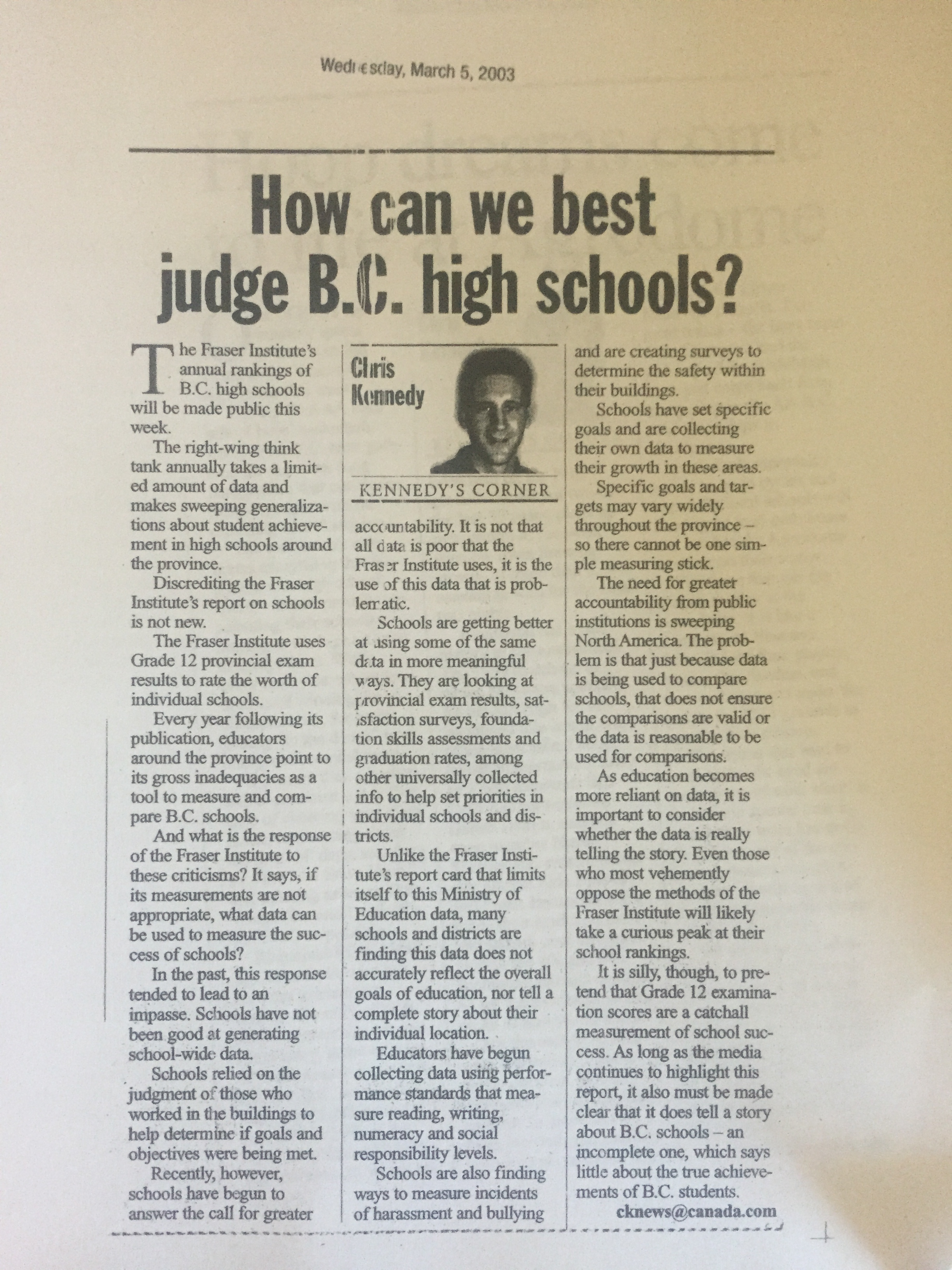 It is a bit like Groundhog Day – if it is May school rankings are out and the education community is screaming foul. And yet we do this dance over and over. At a different time in my life I was a weekly columnist at the Richmond News, and here is one of many posts I wrote on school rankings – this one in 2003.